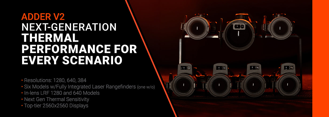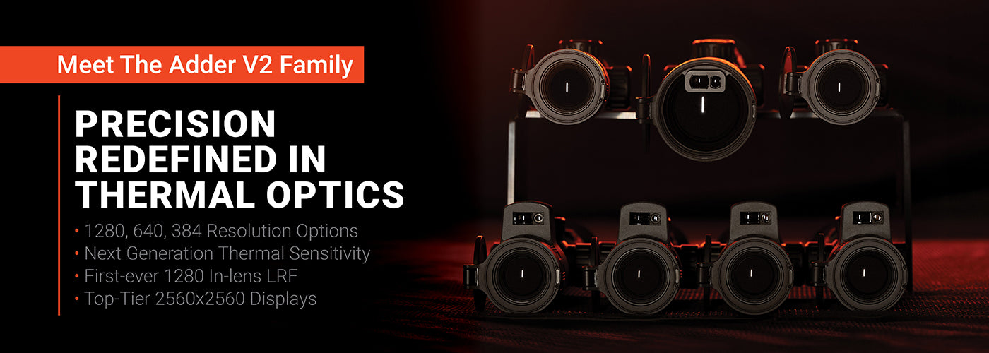 The New AdderV2 35-384 is a supercharged version of the tried-andtrue original Adder 35-384. Not only does it offer an incredible sensor upgrade, from sub-35mk to sub-15mk, but its also utilizes AGM’s first shutterless nuc system. Along with the new thermal sensor, the new micro display gets quite the upgrade as well. The original Adder 35-384 incorporated a 1024x768 display, which is now dramatically improved upon with its new 2560x2560 display, offering hunter’s a firsthand look at AGM’s first ever semi-circular display. It also raises the base magnification from the original model (2.5X) to a more robust 4X. What this means is, a slightly narrower field of view is traded out for crisper images at high magnification. Whereas original Adder 35-384 users had to twice cut their resolution in half by the time they had reached 10X, the new V2 will get you all the way to 16X before doing the same. Typically, a dramatically better image provided by upgraded thermal sensor and displays is enough, it only scratches the surface with all the new improvements that the V2 offers. These include: new red & green monochrome color palettes, 64GB of internal storage capacity, 1000g recoil resistance, display off tilt sensor, media albums which can be viewed on the device (not just your phone), internal 9hr rechargeable battery, a single removable 18650 rechargeable, cold & warm hue viewing modes, and more. All our Adder V2’s include a field-proven American-made ADM one-piece Recon 30mm mount ($220 value).
