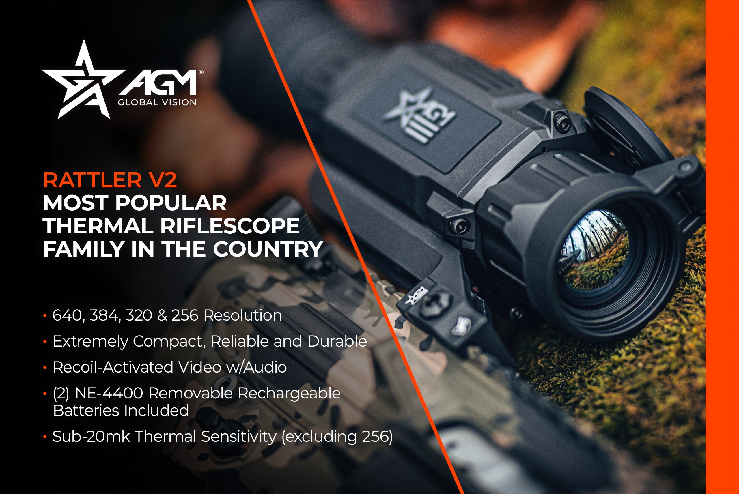 The RattlerV2 25-320 base magnification sits at 3.5X, making an ideal unit for people hunting predators in more wide open spaces. This higher base magnification affords shooters the luxury of going all the way up to 7X before halving the base resolution, which is comparable to many higher resolution thermal scopes that have to cut their base resolution multiple times to get to that high of a magnification level. Also, like all RattlerV2 models, the unit utilizes the best durable housing and battery system on the market. AGM - Vision Without Limits.