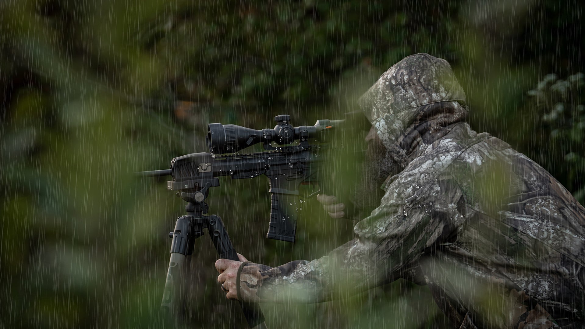 A professional thermal imaging riflescope combining continuous optical magnification with an integrated laser ranging system built directly into the optic pathway. This design delivers smooth zoom capabilities and precision distance measurement in a unified, refined platform optimized for extended-range hunting applications.